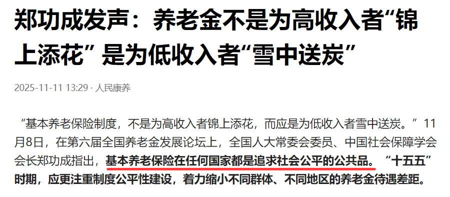 也就是说有人并没有多缴,却多得了。有人可能会说那城乡居民最受益,基础养老金100%来自财政。完全错了,郑功成说这种政策取向的结果必然是“强者通吃”。