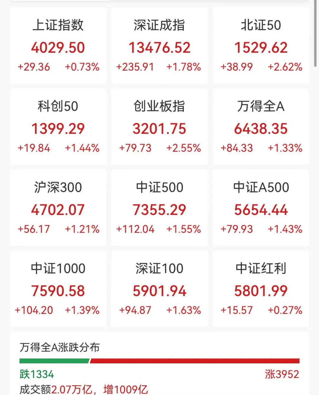 13日,市场全天震荡拉升,三大指数低开高走,沪指刷新十年新高,创业板指涨超2%。截至收盘,沪指涨0.73%,深成指涨1.78%,创业板指涨2.55%。沪深两市成交额2.07万亿。