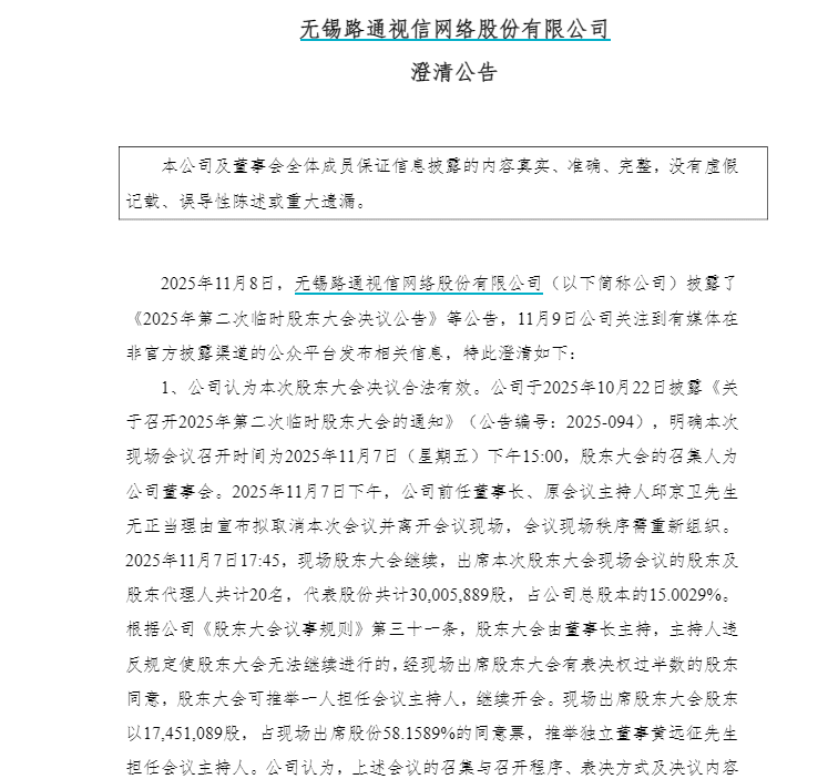 《声明》指出,凡未经公司正式授权、按法定程序刻制并依法备案的冠以“无锡路通视信网络股份有限公司”字样的公章,均属伪造。由“伪造公章”签署的一切文件无效,公司对任何通过伪造公章所实施的一切行为及由此产生的法律后果均不予承认,亦不承担任何责任。