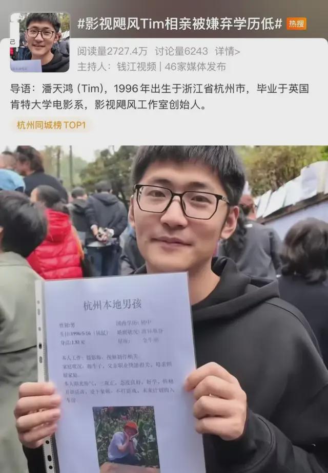 事情是这样的,Tim应粉丝要求去相亲角,并po上简历,“96年出生,杭州本地,国内初中学历,离异单身,父亲职业快递相关”,不料被大妈嫌弃。