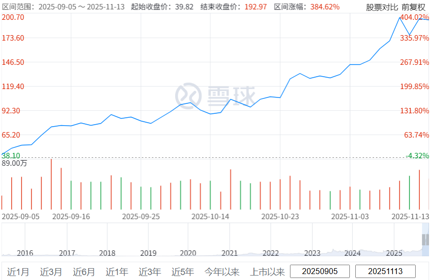 其股价从9月5日的低点开始,一路震荡上行,到11月11日盘中创下204.57元/股的新高。