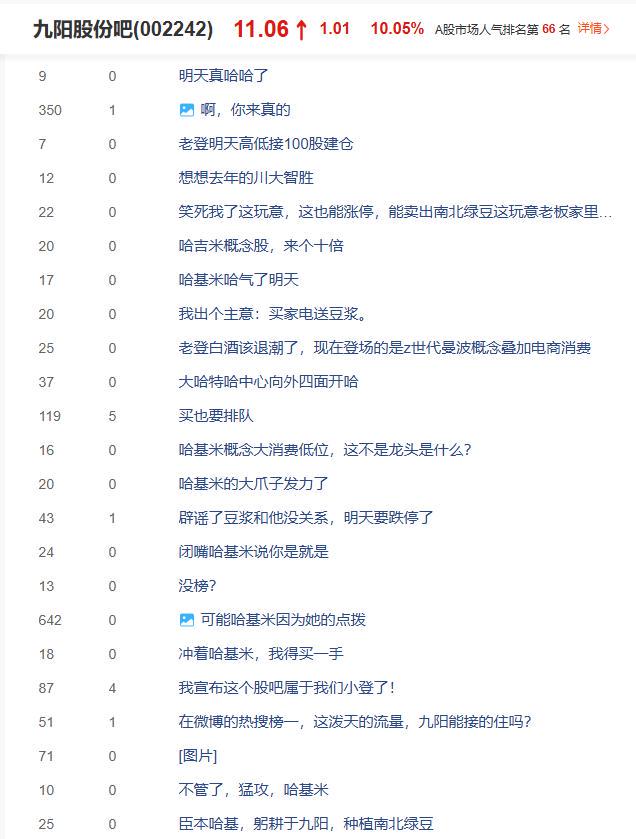 虽然九阳股份进行了澄清,但股吧中,网友留言含“哈”量依旧十足。