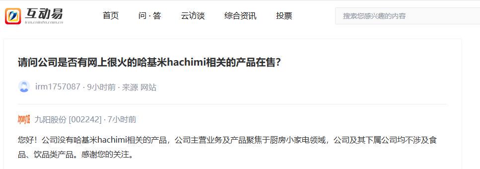 13日午间,九阳股份在互动平台表示,公司没有哈基米hachimi相关的产品,公司主营业务及产品聚焦于厨房小家电领域,公司及其下属公司均不涉及食品、饮品类产品。
