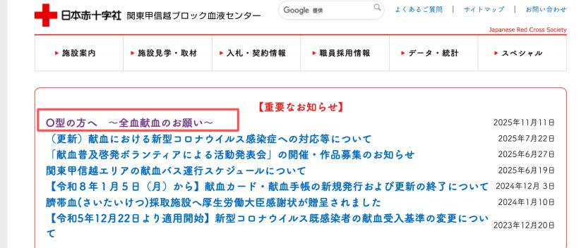11月11日,日本红十字会的地方献血中心开始在首页头条,紧急征集O型血,表示“目前全国范围内 O 型血的获取存在困难,尤其需要 O 型血人士的配合。”