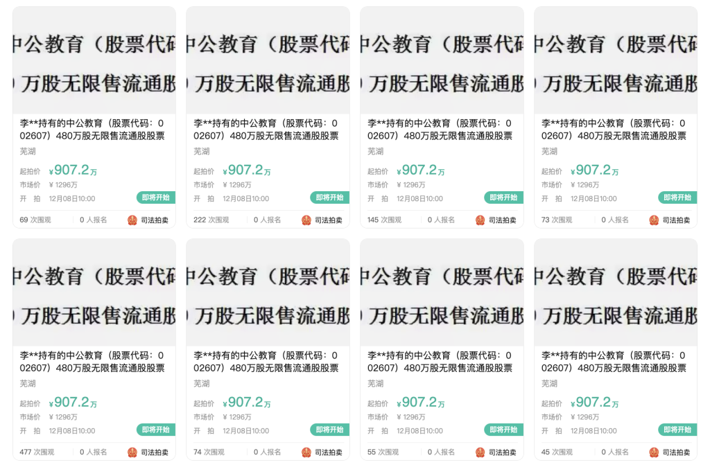 阿里资产司法平台显示,上述4800万股股份被分为10个标的,每一个标的物“李**持有的中公教育(股票代码:002607)480万股无限售流通股股票”的起拍价为907.2万元。