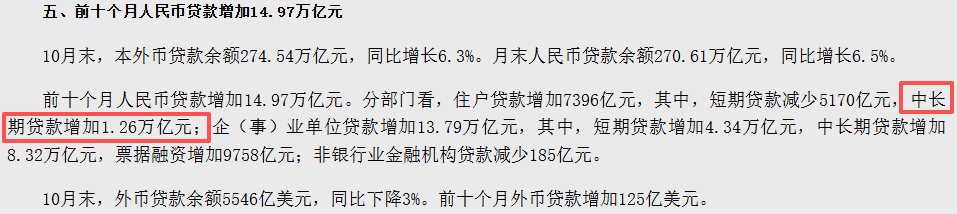 看住户中长期贷款表现就略知一二了,今年前10月,住户中长期贷款增加1.26万亿。