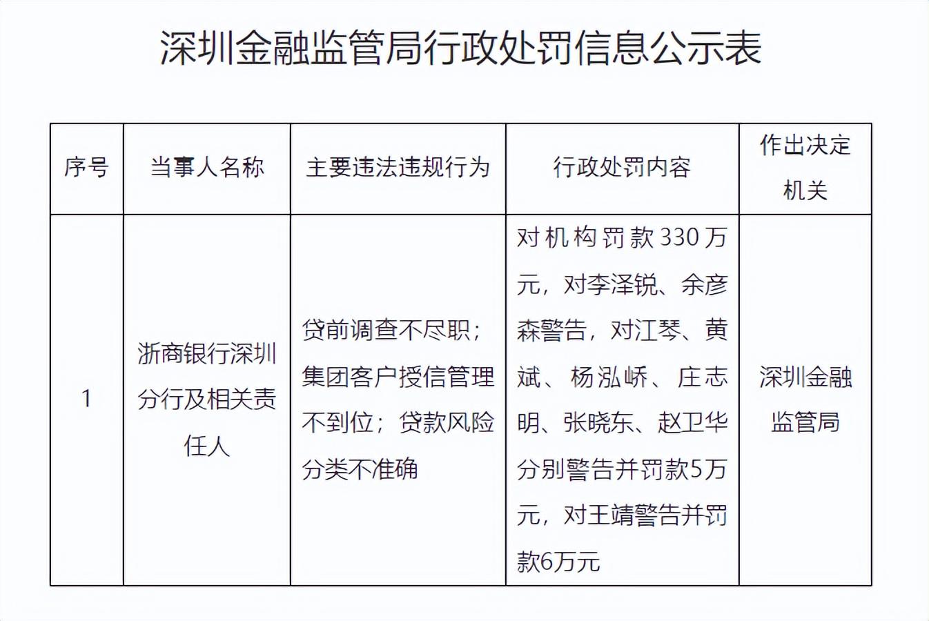 处罚信息显示,浙商银行深圳分行主要存在贷前调查不尽职、集团客户授信管理不到位、贷款风险分类不准确等多项违规行为。