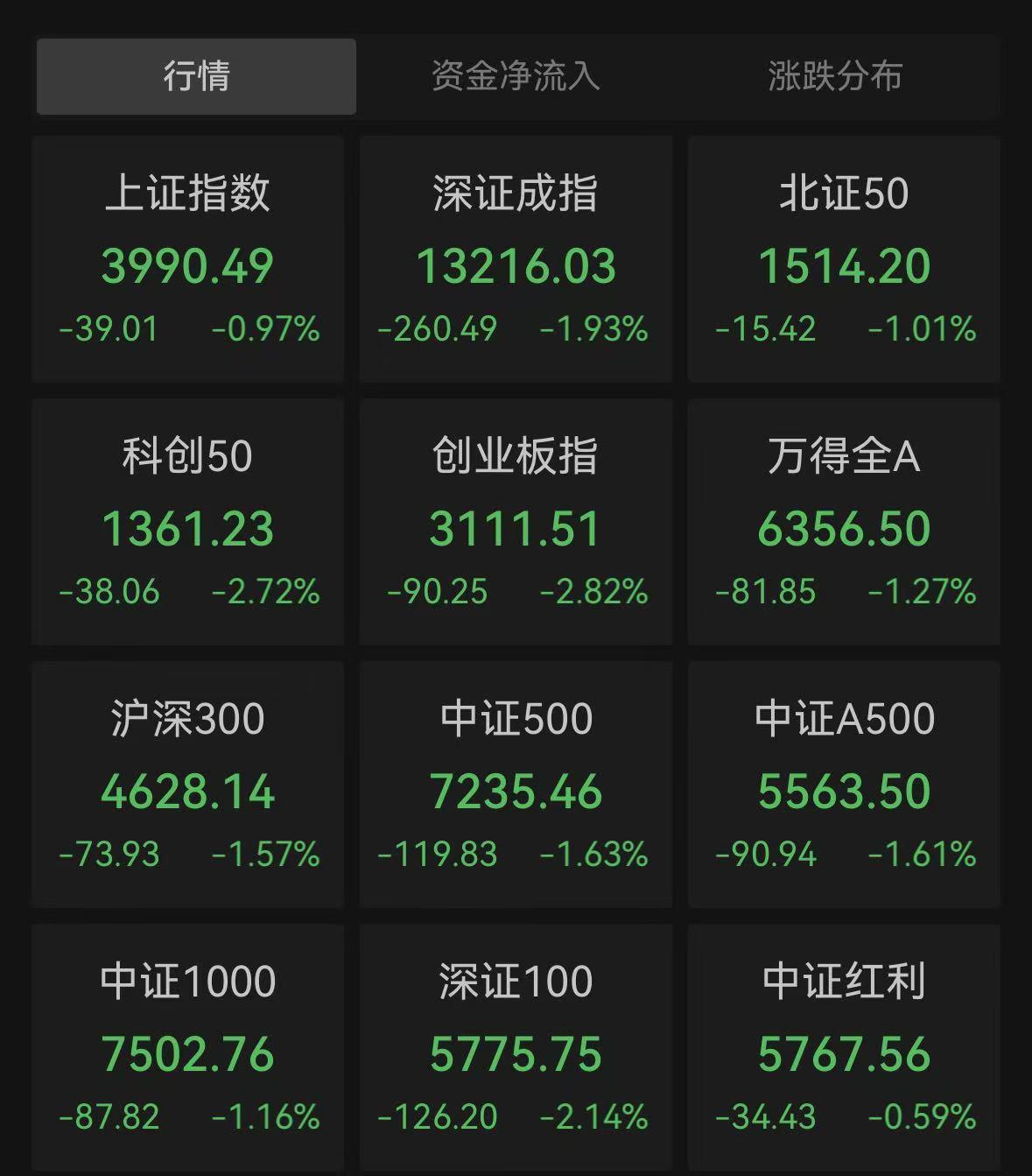 截至收盘,沪指跌0.97%失守4000点,深成指跌1.93%,创业板指跌2.82%。