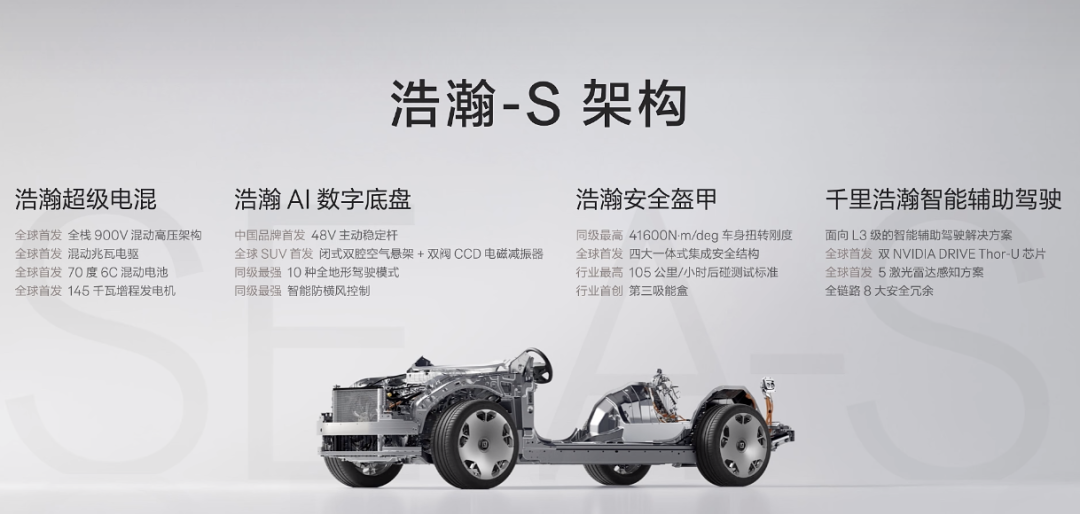 极氪9X基于全球首个豪华电混专属架构浩瀚-S打造,首发搭载“浩瀚超级电混+浩瀚AI数字底盘+浩瀚安全盔甲+千里浩瀚安全辅助驾驶”四大核心科技。