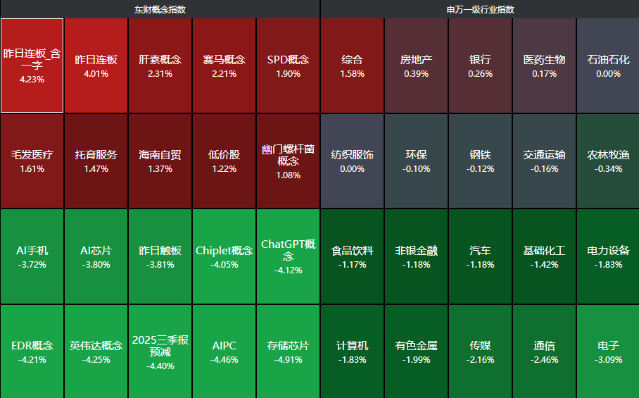 最后简单看下盘面,截至收盘,上证指数跌幅为0.97%,创业板指跌幅为2.82%,市场成交额不足两万亿;港股恒生指数跌幅为1.85%,恒生科技指数跌幅为2.82%。