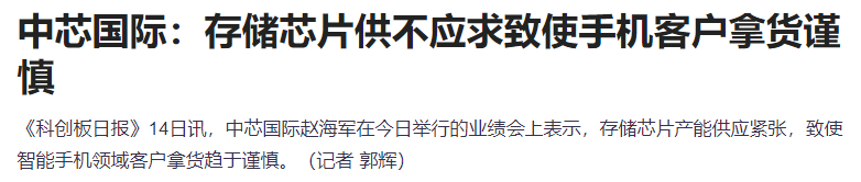 中芯国际赵海军在今日举行的业绩会上表示,存储芯片产能供应紧张,致使智能手机领域客户拿货趋于谨慎。这也是我之前的一个担忧,虽然数据中心需求强劲,但消费电子却比较低迷,存储大幅涨价会抑制需求。