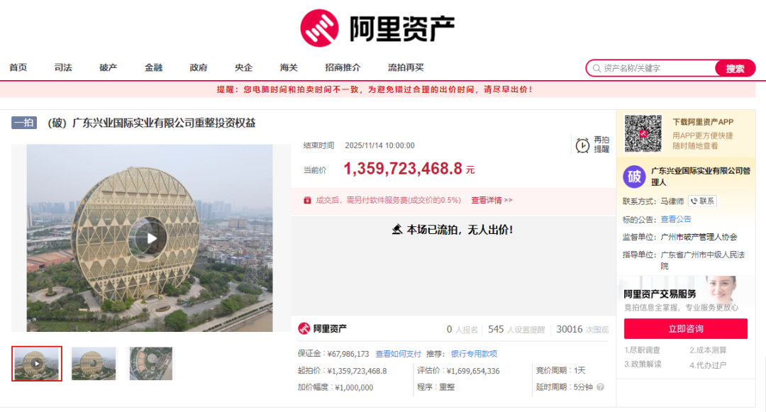 阿里拍卖平台披露的信息显示,11月14日10点,广东兴业国际实业有限公司重整投资权益因无人竞拍而流拍。拍品所有人为广东兴业国际实业有限公司,拍卖原因系破产重整。
