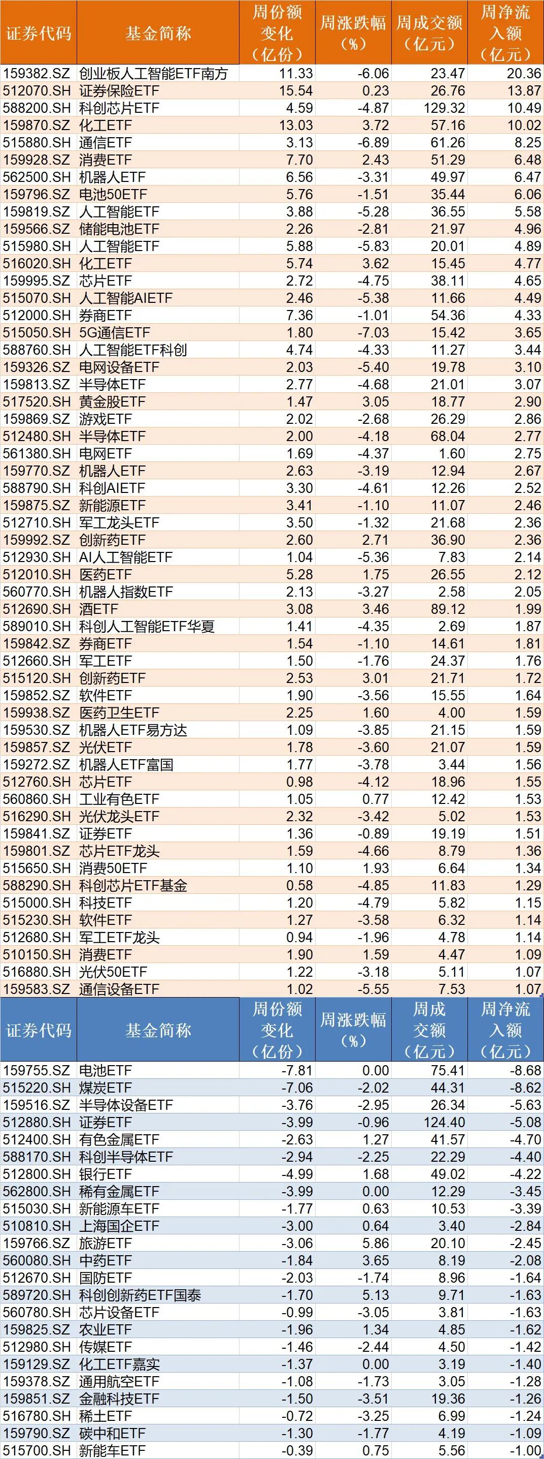 在行业主题ETF方面,本周净流入资金超1亿元的基金有54只,其中创业板人工智能ETF南方、证券保险ETF和科创芯片ETF分别增加了11.33亿份、15.54亿份和4.59亿份,净流入资金20.36亿元、13.87亿元和10.49亿元。