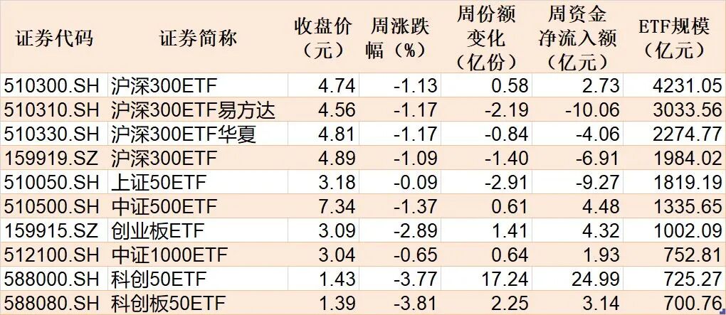 具体ETF方面,规模较大的10只宽基指数ETF本周合计净流入11.29亿元,其中沪深300ETF易方达净流出10.06亿元,科创50ETF净流入24.99亿元。