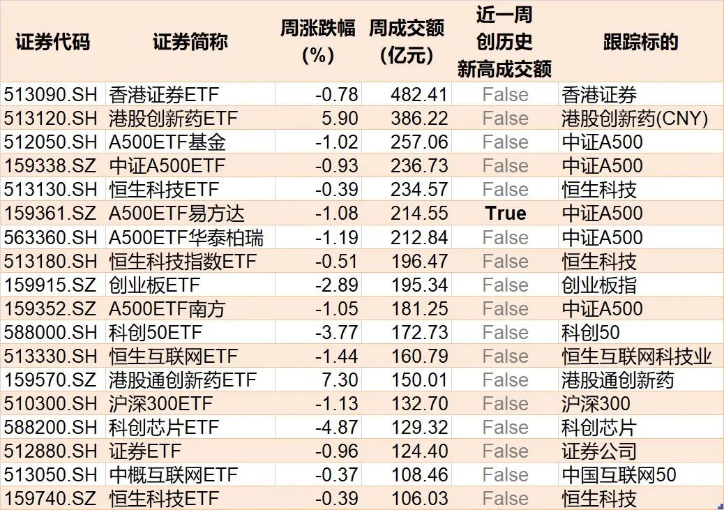 其中,香港证券ETF周成交额近500亿元。另外,本周A500ETF易方达成交额创历史新高。