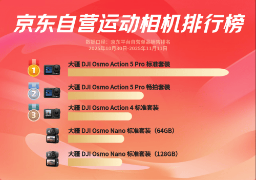 一年一度的双十一大促,不仅是消费热潮的风向标,也正在成为观察智能影像行业竞争格局的重要窗口。根据京东自营平台在10月30日至11月11日期间发布的销售榜单显示:大疆DJI凭借多款产品的强势表现,包揽运动相机品类前五名,成为今年双十一期间无可争议的赢家。