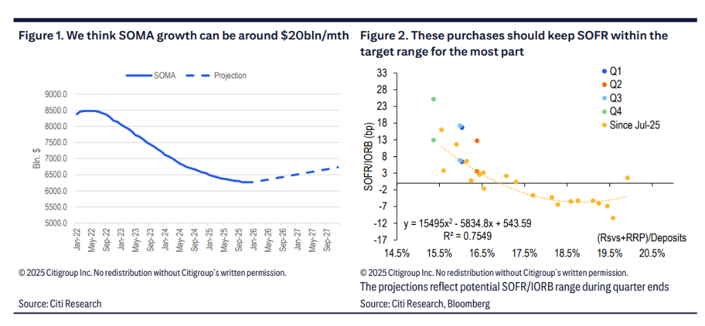 具体操作上,这意味着美联储将对所有到期的国债进行再投资,并在此基础上额外购买约200亿美元国债,用以抵消抵押贷款支持证券(MBS)到期造成的资产减少。花旗认为,这一购买规模足以在明年正常交易日将SOFR(以及担保国债回购利率TGCR)控制在目标区间内。
