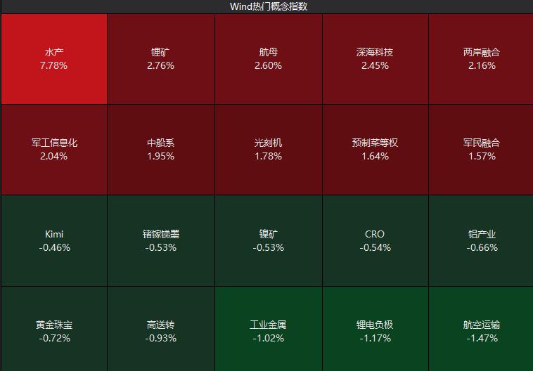 盘面上,船舶制造、能源金属等板块涨幅居前,水产养殖概念大涨,贵金属、航空机场板块跌幅居前。