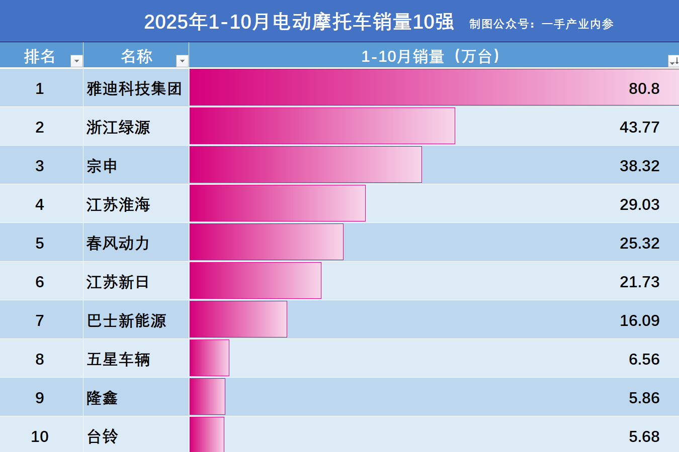 另附:2025年1-10月电摩销量10强厂商名单,数据源于:中国摩托车商会。