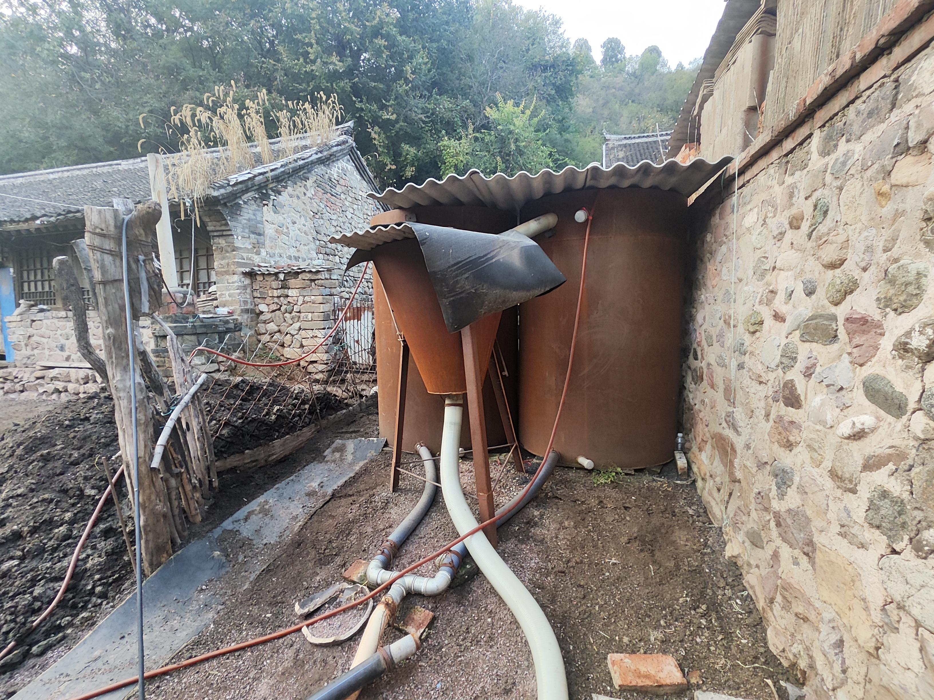 在清河沿村一户村民的院子里,新京报记者看到,两只铁桶并列放置,高约两米,每只直径约一米,铁桶上方和下方分别有一根进水管和一根排水管与之相连。