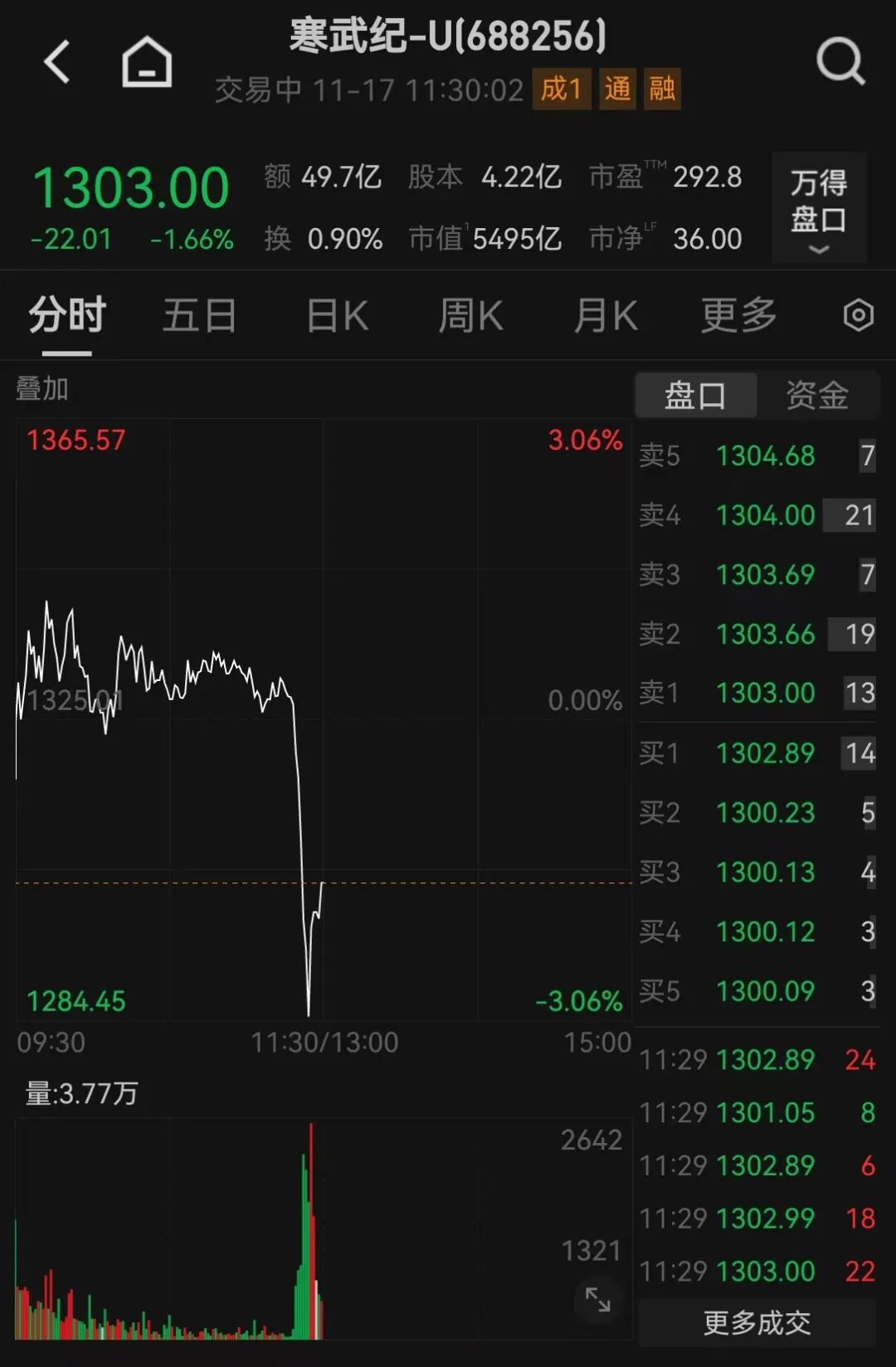 11月17日,寒武纪小幅低开,盘中窄幅震荡,临近午间收盘,该股股价突然直线跳水,一度跌逾3%。
