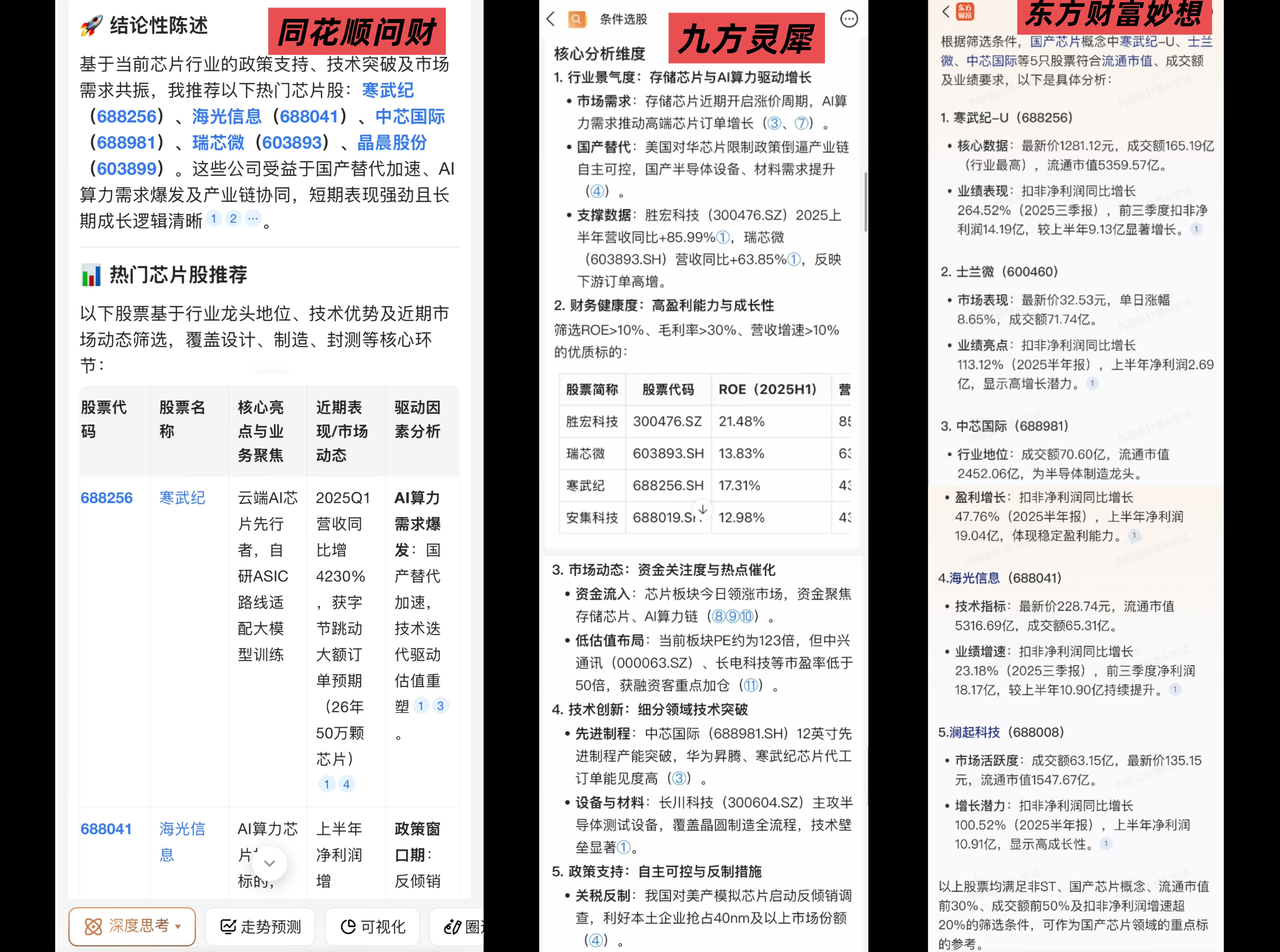 在条件选股方面,课题组分别请它们对芯片板块后市潜力进行分析,对值得关注的芯片股进行筛选,并解读近期的政策和行业动态对芯片股的影响。测评对比发现,三款AI投顾智能体都有一套自己的筛选具体条件。其中,同花顺问财和九方灵犀的筛选条件较为相似,具体而言,同花顺问财会筛选综合估值百分位<30%、ROE>5%、营收增速>10%、毛利率>30%、股息率>5%的标的,九方灵犀会通过查询A股数据,选出最新财报数据中ROE>10%、营收增速>10%、毛利率>30%的标的。而东方财富妙想则是筛选非ST、流通市值前30%、成交额前50%、扣非净利润增速>20%的前5名标的。