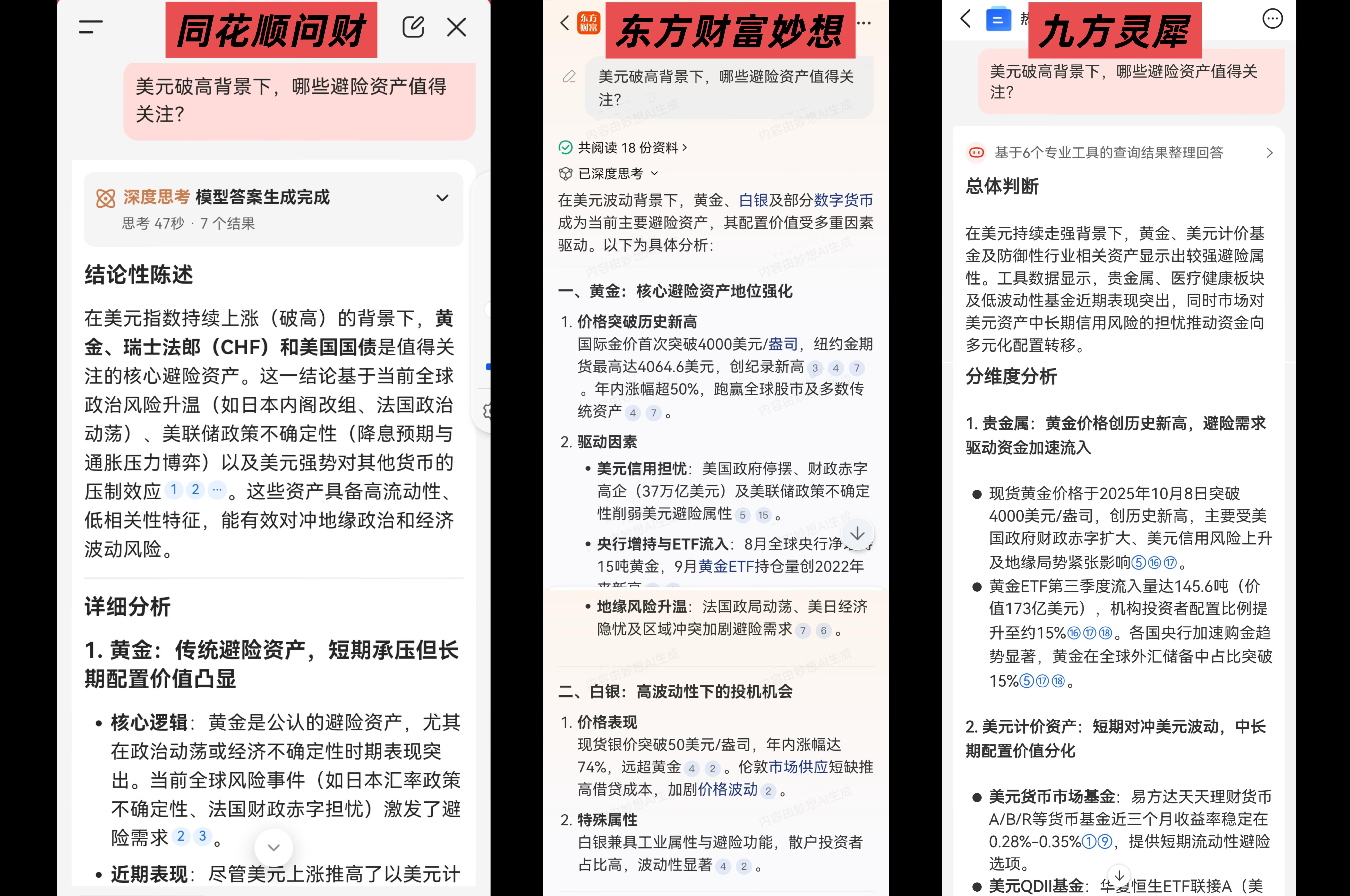 根据这一背景,在热点解读这一核心功能板块,课题组在测评中首先对三款AI投顾智能体分别提问:“美元破高背景下,哪些避险资产值得关注?”三款AI投顾智能体均在回答中对这一热点话题进行了多维度解读。回看它们的思考过程,都对各自体系中的专业数据库和搜索引擎进行了调用,查询相关指数数据、研报和资讯等进行整合分析。从回答来看,同花顺问财和东方财富妙想的回答比较类似,都提到了黄金或白银等贵金属作为传统避险资产的优势,也都提到了瑞士法郎和美国国债。九方灵犀的回答则有更多细节,不仅提到了贵金属和美元计价资产,还提供了更有启发性的细节分析,例如在贵金属方面,分析了现货黄金和黄金ETF近期的情况和走向,在美元计价资产方面,分析了美元货币基金、美元QDII基金中近期表现较好的基金。值得一提的是,九方灵犀的回答中还提到了医疗、消费板块的防御性行业基金,并延伸分析了一些低波动资产,为用户个性化解读后市机会。