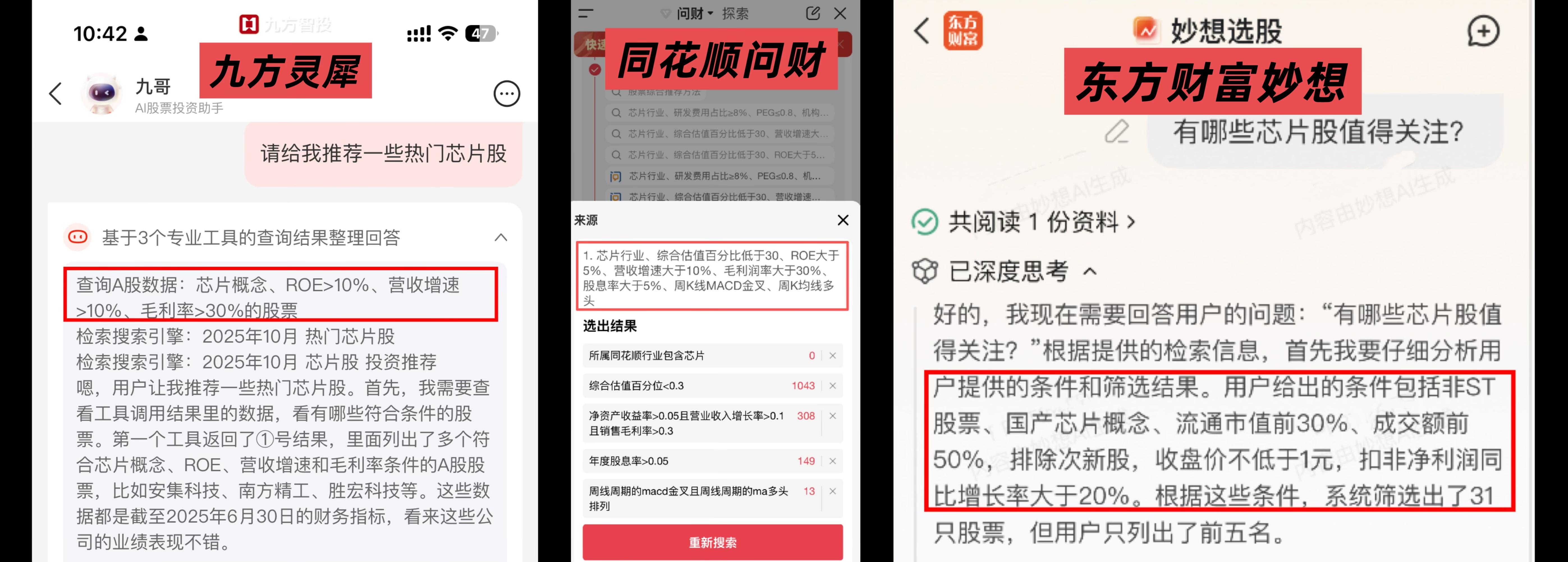 三款AI投顾智能体在为用户筛选股票时有不同的分析解读风格。(来源:南方都市报、南都大数据研究院课题组测评截图)