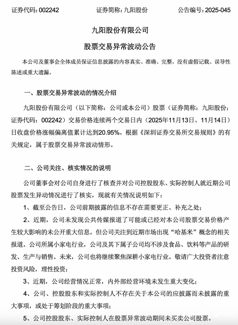 11月17日,九阳股份发布股票交易异常波动公告,针对近期“哈基米” 概念相关市场热度作出澄清。公司明确表示,自身及下属子公司均不涉及食品、饮料类产品的研发、生产与销售。未来,公司也将继续聚焦深耕小家电行业。公司提醒广大投资者注意投资风险,理性投资。