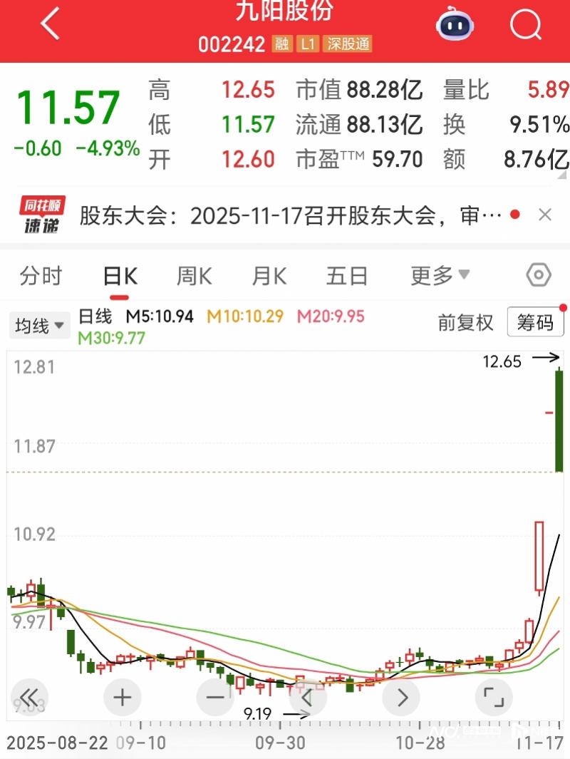 而受此影响,近日受到股民热捧的“豆浆概念股”九阳股份终于开始下跌,截至11月17日收盘时,九阳股份股价下跌4.93%,现股价为11.57元。