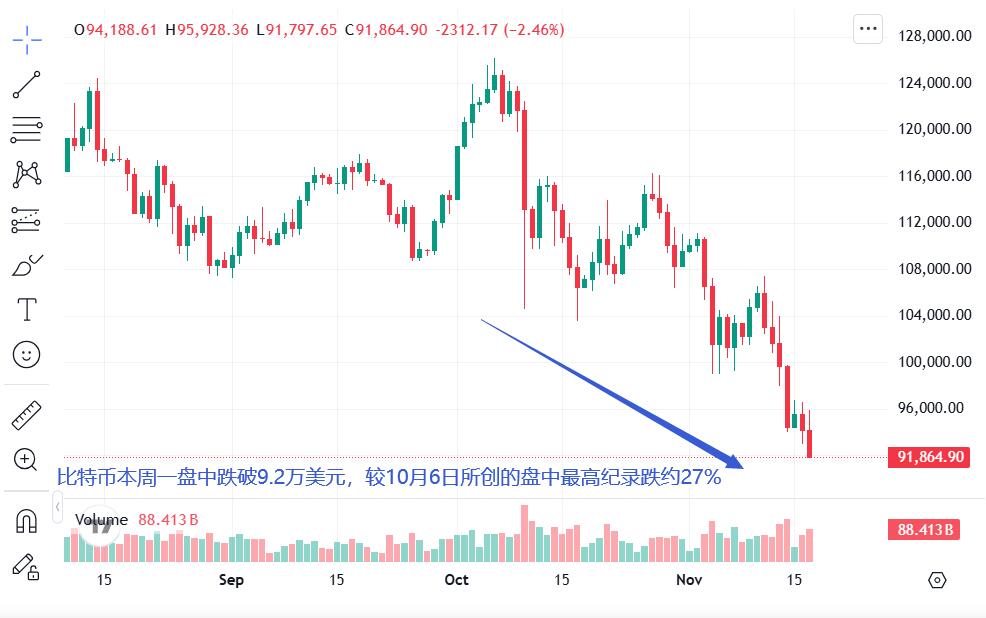 至少目前看来,Strategy的“抄底”并未提振市场情绪。CoinMarketCap数据显示,美东时间17日周一美股午盘,亚市盘初曾跌破9.3万美元的比特币跌破9.2万美元,创近七个月新低,较欧股盘中的日高跌超4000美元、跌超4%,较10月6日所创的盘中最高纪录跌去超过3万美元、累计暴跌约27%。