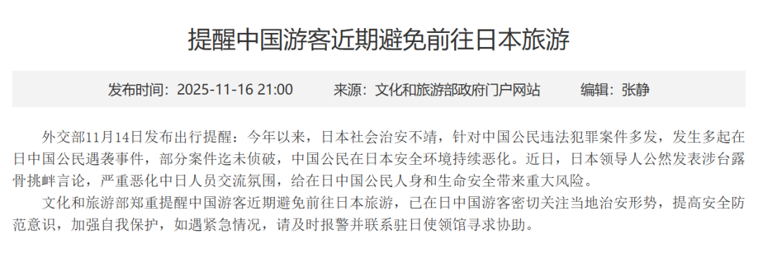 刘宇星和朋友之所以要改变出游目的地,是因为她们看到了文旅部发布的中国游客近期避免前往日本旅游的提醒。文旅部在官网郑重提醒中国游客近期避免前往日本旅游,已在日中国游客密切关注当地治安形势,增强安全防范意识,加强自我保护,如遇紧急情况,请及时报警并联系驻日使领馆寻求协助。