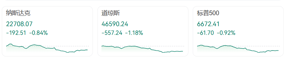 截至收盘,道琼斯工业平均指数下跌557.24点,跌幅1.18%,收于46590.24 点,纳斯达克综合指数跌0.84%,收于22708.07点,标准普尔500指数跌0.92%,收于6672.41点,4月以来首次跌破50日均线重要心理支撑,衡量市场波动性的芝加哥商业交易所Cboe恐慌指数VIX大涨12.97%,报22.39。