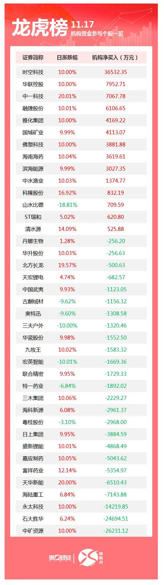 11月17日龙虎榜中,共39只个股出现了机构的身影,有14只股票呈现机构净买入,25只股票呈现机构净卖出。当天机构净买入前三的股票分别是时空科技、华联控股、中一科技;当天机构净卖出前三的股票分别是中矿资源、石大胜华、永太科技。