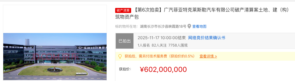 京东资产交易平台显示,广汽菲克核心资产此次分为两起拍卖,成交价分别为6.02亿元和3.48亿元。其中一位竞得者背后,还浮现出上市公司蓝思科技(300433.SZ)的身影。