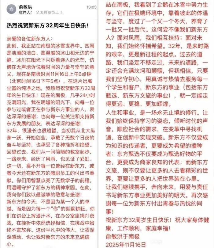 俞敏洪又上热搜了,原因是他发了一封内部信,庆祝新东方创立32周年。信件内容其实没什么特别的,就是说了一些感谢的话,还有就是希望大家一起努力,创造更好的未来。但问题出在俞敏洪正在南极旅游,还多次提到南极,这引发了一些员工的不满和吐槽。