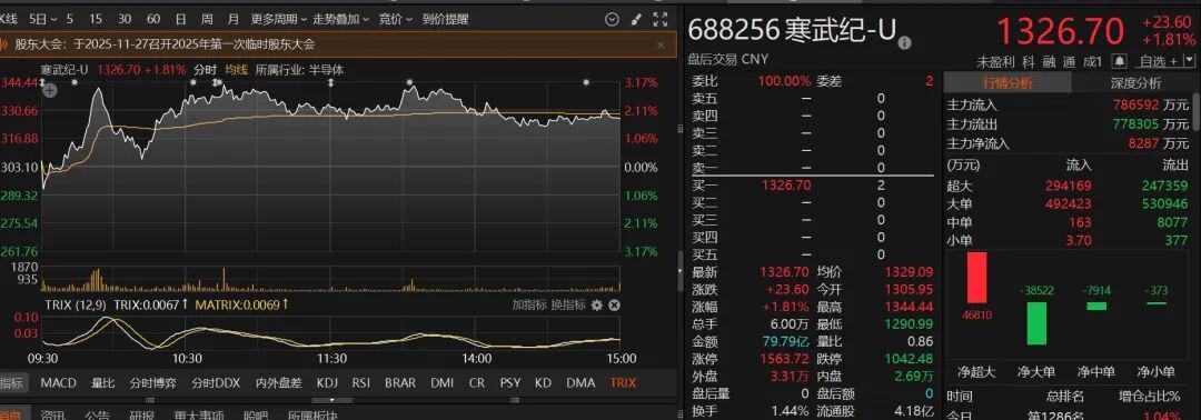 半导体利好不断,寒武纪午后最大涨幅超过3%
