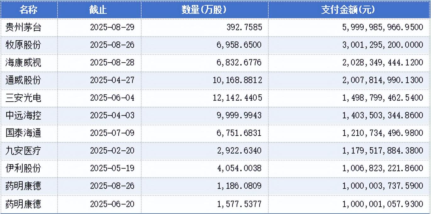 从已完成股份回购的企业支付金额来看,贵州茅台、牧原股份、海康威视、通威股份、三安光电、中远海控、国泰海通、九安医疗、伊利股份、药明康德的回购支付金额较高,均超10亿元。