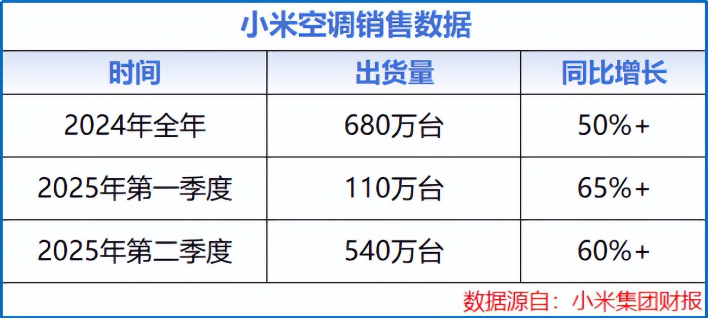 2024年,小米空调出货量超680万台,同比增长超50%;2025年增长势头依旧迅猛,仅第二季度出货量就突破540万台,且已连续三个季度保持50%以上的同比增长。