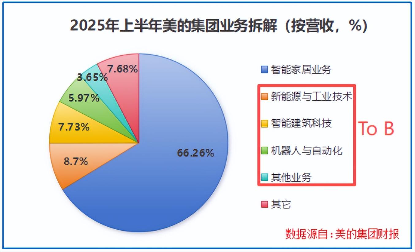 近年来,公司通过收购库卡机器人、控股合康新能等,不断扩展工业自动化、新能源、机器人等To B业务。2025年上半年,其To B业务合计实现收入657亿元,占比已达26%。
