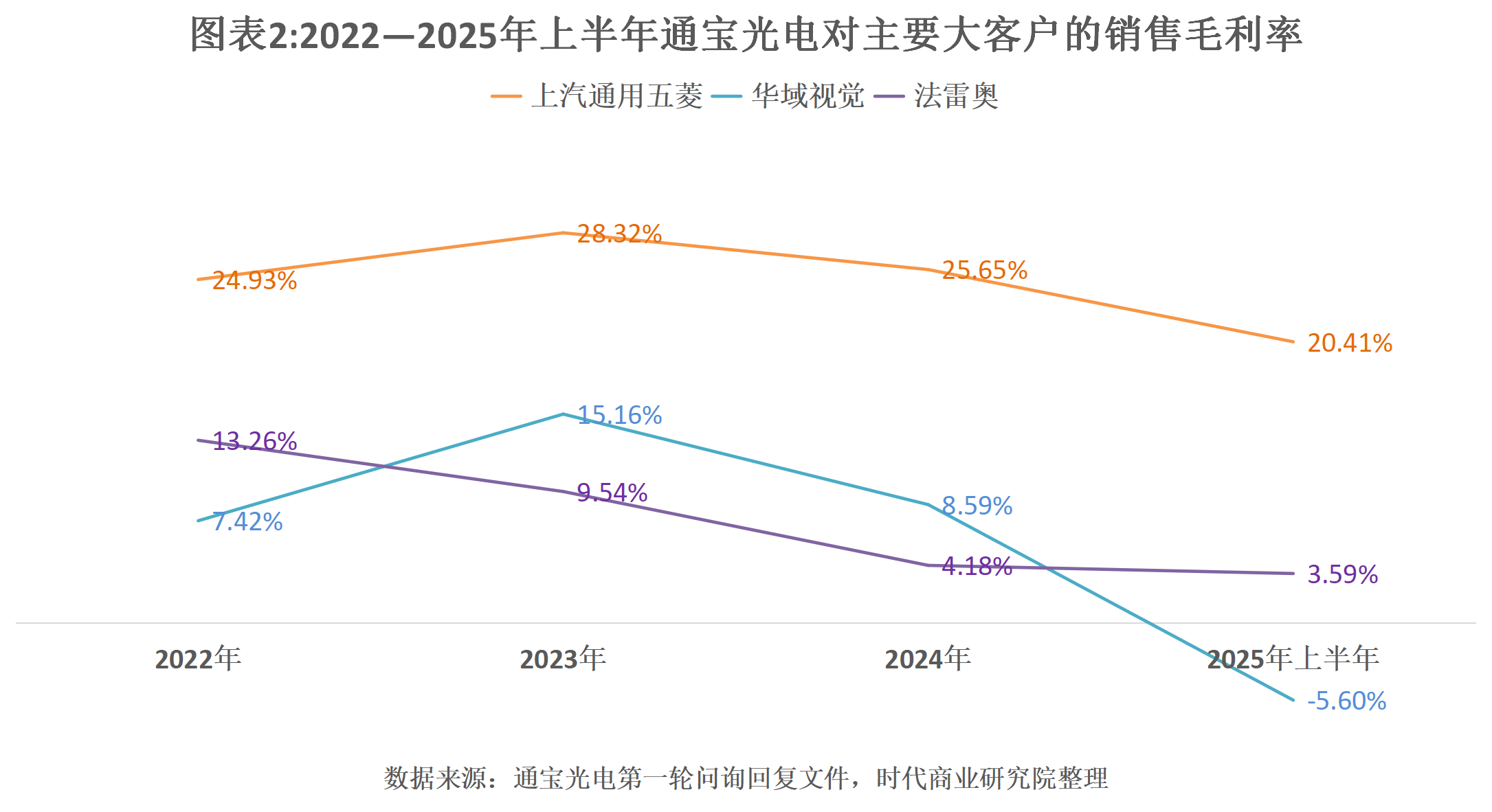 第一轮问询回复文件显示,今年上半年,通宝光电对上汽通用五菱汽车股份有限公司(下称“上汽通用五菱”)的销售毛利率为20.41%,跟2024年相比下降5.24个百分点;同期,对华域视觉科技(上海)有限公司(下称“华域视觉”)、法国法雷奥集团(下称“法雷奥”)的销售毛利率分别为-5.60%、3.59%,跟2024年相比分别下降14.19个百分点、0.59个百分点。
