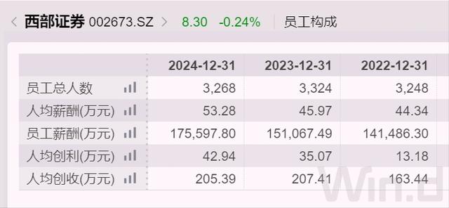 至2024年末,西部证券职工总数不到3300人,去年人均创利大约43万元,人均税前薪酬超过53万元,比2023年增加7.3万元。2024年,多家券商减薪,西部证券则是逆势涨薪。