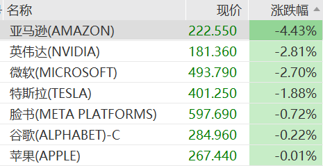 大型科技股普跌,费城半导体指数领跌,迈威尔科技跌近6%,超威半导体跌超4%。亚马逊跌4.4%,市值一夜蒸发1103亿美元(约合人民币7839.90亿元)。微软跌2.7%,特斯拉跌1.9%。美股“七巨头”本月迄今已下跌了近5%。