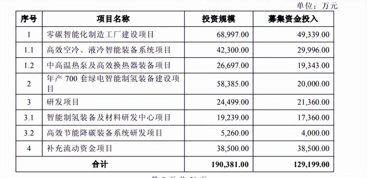 具体项目包括:零碳智能化制造工厂建设项目、高效空冷、液冷智能装备系统项目、中高温热泵及高效换热器装备项目、年产 700 套绿电智能制氢装备建设项目、研发项目、智能制氢装备及材料研发中心项目、高效节能降碳装备系统研发项目,分别投向4.93亿元、3亿元、1.93亿元、2亿元、2.14亿元、1.74亿元、4000万元,剩余3.85亿元用于补流。