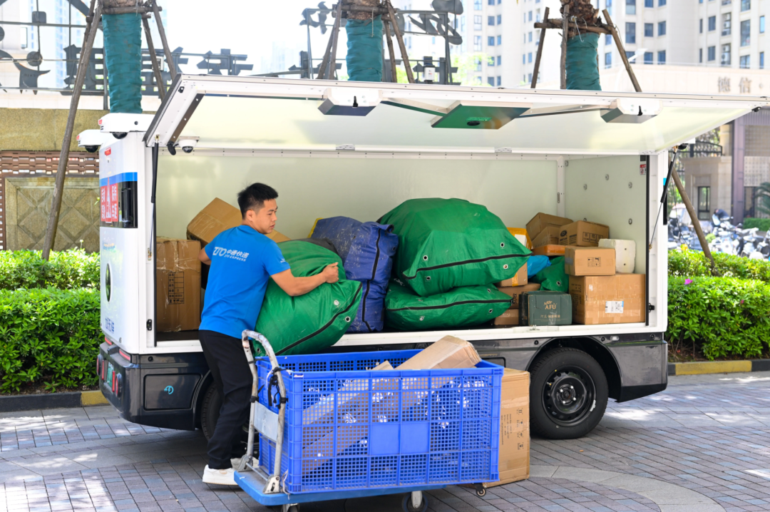 在新的配送体系中,无人配送车充当着“移动驿站”的角色,负责将数百个包裹从区域分拣中心批量运送到社区驿站。这段“枢纽到驿站”的骨干运输,替代了快递员以往需要骑着满载的三轮车多次往返的重复性劳动。