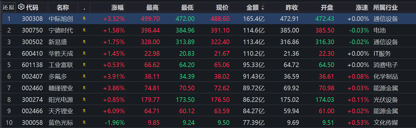 中际旭创成交额居首,为165.4亿元。其后是宁德时代、新易盛、华胜天成、工业富联,成交额分别为114.6亿元、113.4亿元、110.2亿元、95.3亿元。