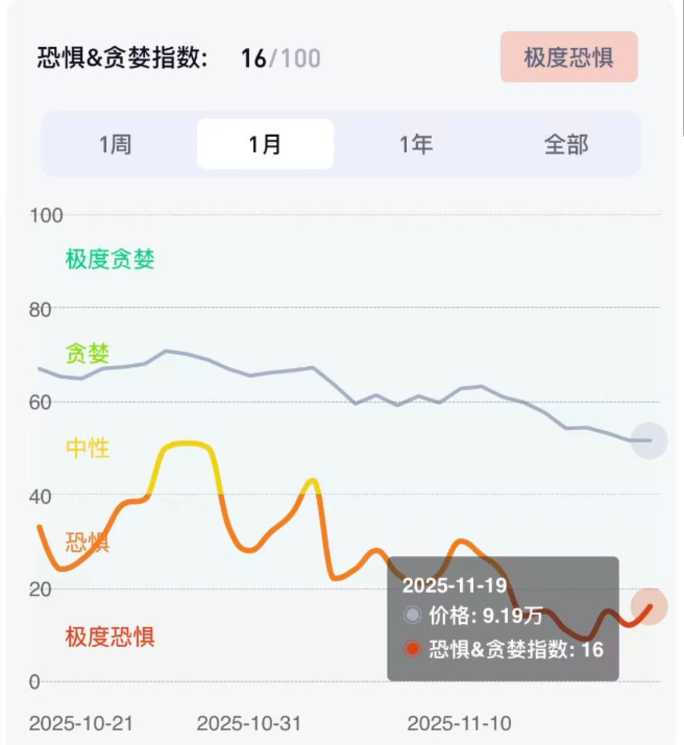 情绪传染加速下跌进程。社交平台监测显示,11月中旬"比特币崩盘""熊市来了"等关键词搜索量暴增5倍,Twitter相关话题阅读量超20亿次。情绪指标"恐惧与贪婪指数"跌至16,进入"极度恐惧"区间,这种恐慌情绪通过加密社区快速传播,导致原本可控的抛压演变为集体出逃。Bitwise Asset Management首席投资官Matthew Hougan表示:“加密货币零售市场的情绪相当悲观。”加密货币分析师Ted Pillow更是表示,“他们不想再经历一次50%的回调。人们正在抢先一步,退出市场。”