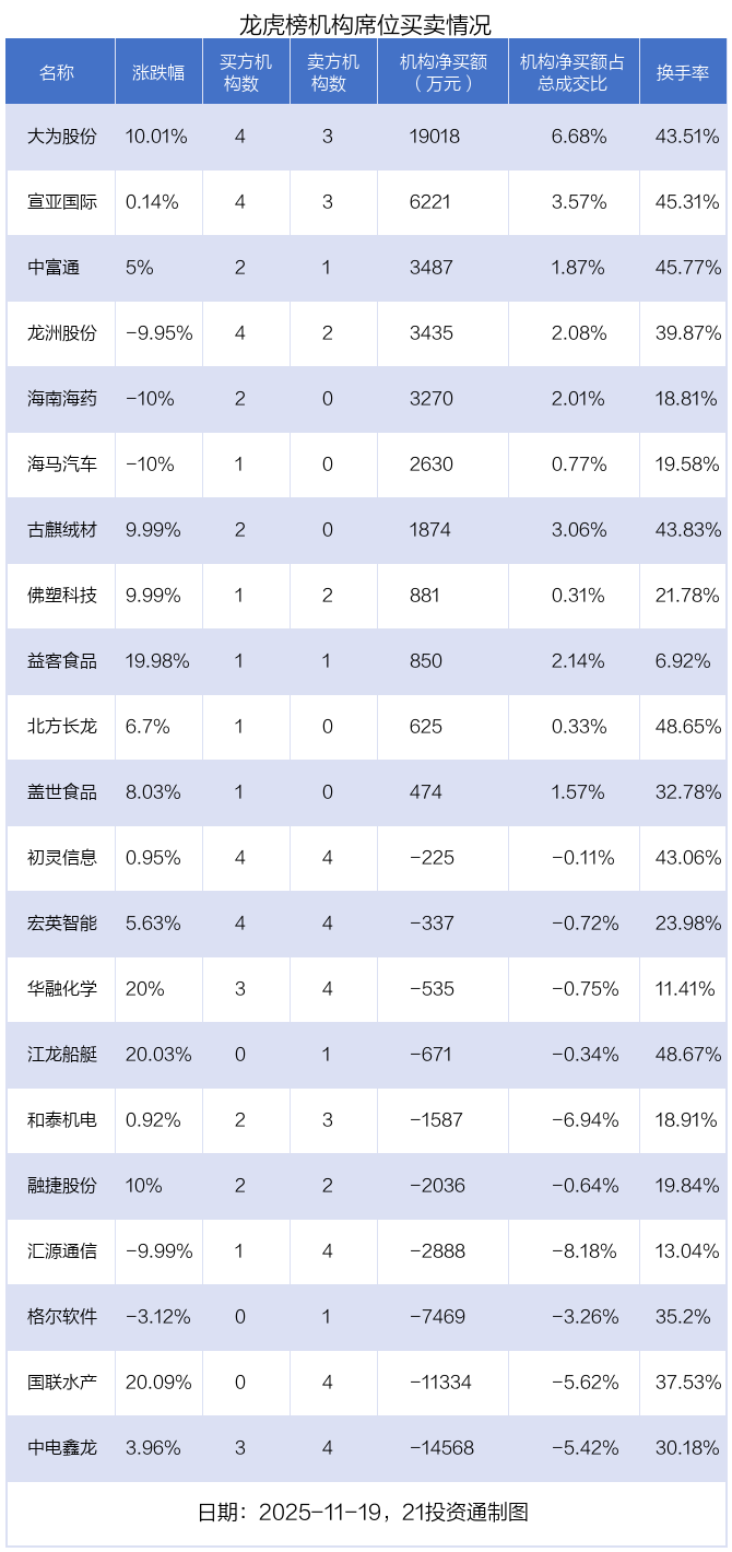 其中,机构净买入金额最多的是大为股份(002213.SZ),当日收盘上涨10.01%,换手率为43.51%。