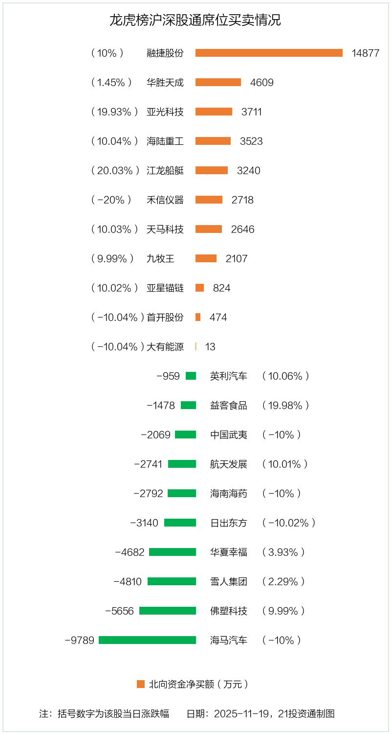 11月19日,北向资金参与龙虎榜中的个股共有21只,合计净买入625.62万元。其中沪股通净买入7股,净卖出3股,合计净买入4610.61万元;深股通净买入4股,净卖出7股,合计净卖出3984.99万元。