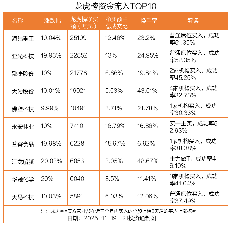 11月19日,上证指数上涨0.18%,深证成指下跌0%,创业板指上涨0.25%。盘后龙虎榜数据显示,共有47只个股因当日异动登上龙虎榜,资金净流入最多的是海陆重工(002255.SZ),达2.52亿元。